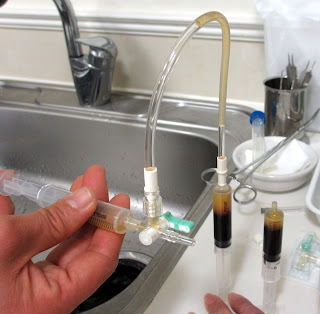 取り出して、血漿を採取します。シリンジ立ては、東急ハンズで材料を吟味・加工して、さらに進化しました(^^)。